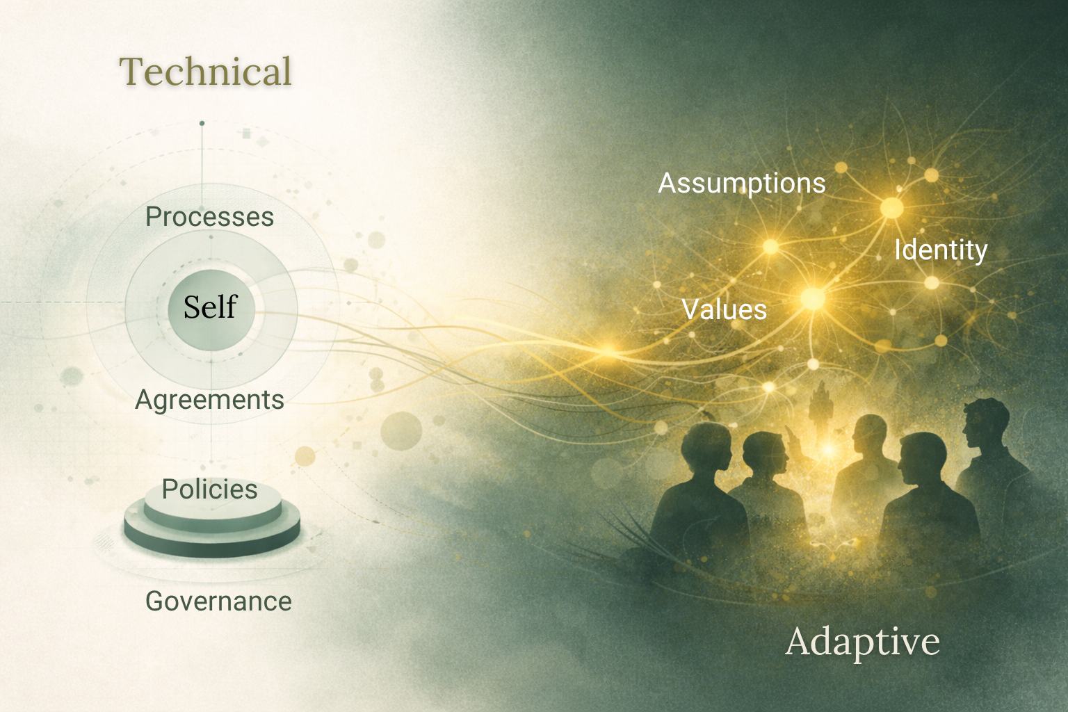 One of the most important distinctions for organizations today is the difference between technical problems and adaptive challenges. Technical problems can be addressed with existing expertise, processes, or tools. Adaptive challenges require people to learn new ways of thinking and relating, often involving changes to identity, values, and assumptions.